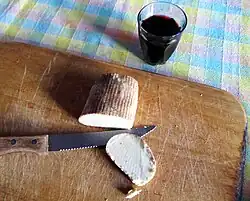 A cheeseboard (or cheese course) may be served at the end of a meal before or following dessert, or replacing the last course. The British tradition is to have cheese after dessert, accompanied by sweet wines like port. In France, cheese is consumed before dessert, with robust red wine.[50][51] A cheeseboard typically has contrasting cheeses with accompaniments, such as crackers, biscuits, grapes, nuts, celery or chutney.[51]