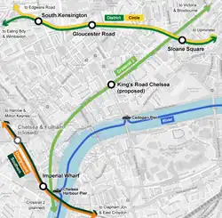 There is a proposal to construct a Chelsea Underground station on the King's Road as part of the Crossrail 2 project (also known as the Chelsea-Hackney line). The project, run by Transport for London, has not yet been approved or funded but is at the consultation stage.[25] According to plans published by TfL in 2008, it is envisaged that the station would be located on the Dovehouse Green area of King's Road.[26] In late 2020 central government shelved plans to progress the Crossrail 2 project.[27]