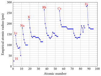 Variation in atomic radius by atomic number, listing hydrogen and the alkali elements