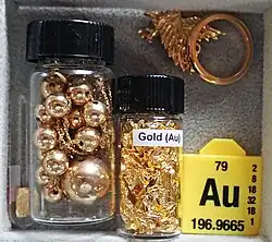 Illustration of two meanings of "chemical element": gold as an atom and gold as a substance