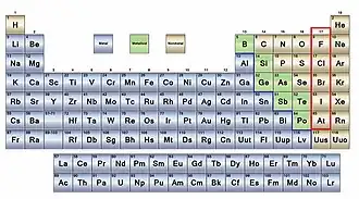 Distinguishing terms are used for certain sets of the more broadly viewed metals and nonmetals. These sets include: actinides, alkali metals, alkaline earth metals, halogens, lanthanides, transition metals, post-transition metals, metalloids, reactive nonmetals, and noble gases. In this system, the alkali metals, alkaline earth metals, and transition metals, as well as the lanthanides and the actinides, are special groups of the metals viewed in a broader sense. Similarly, the reactive nonmetals and the noble gases are nonmetals viewed in the broader sense.[70] In some presentations, the halogens are not distinguished, with astatine identified as a metalloid and the others identified as nonmetals.