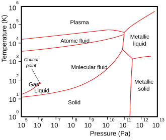 Phase diagram of hydrogen, showing the element state for different combinations of temperature and pressure. Theoretically, at a sufficiently high pressure (such as the interior of Jupiter), hydrogen becomes metallic.[80]