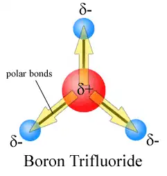 A molecule may be nonpolar either when there is an equal sharing of electrons between the two atoms of a diatomic molecule or because of the symmetrical arrangement of polar bonds in a more complex molecule. For example, boron trifluoride (BF3) has a trigonal planar arrangement of three polar bonds at 120°. This results in no overall dipole in the molecule.