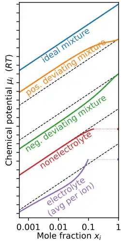 The adjacent figure shows the dependence of on for various hypothetical substances, where a logarithmic scale is used for (so the above limiting forms appear as straight lines). The dashed lines show, for each case, one of the two limiting forms stated above. Note that for the special case of an ideal mixture (ideal solution), the chemical potential is exactly over the entire range, and .