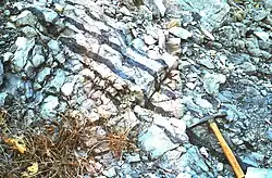 Bedded chert, also known as ribbon chert, takes the form of thinly bedded layers (a few centimeters to a meter in thickness[22]) of nearly pure chert separated by very thin layers of silica-rich shale.[23] It is usually black to green in color, and the full sequence of beds may be several hundred meters thick. The shale is typically black shale, sometimes with pyrite, indicating deposition in an anoxic environment.[21] Bedded chert is most often found in association with turbidites, deep water limestone, submarine volcanic rock,[23] ophiolites, and mélanges on active margins of tectonic plates.[24] Sedimentary structures are rare in bedded cherts.[23] The typically high purity of bedded chert, like the high purity of other chemically precipitated rock, points to deposition in areas where there is little influx of detrital sediments (such as river water laden with silt and clay particles.)[25] Such impurities as are present include authigenic pyrite and hematite, formed in the sediments after they were deposited, in addition to traces of detrital minerals.[4]