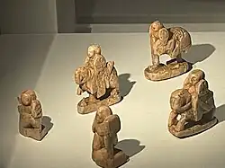 ![]() Part of a Staunton chess setLeft to right: white king, black rook, black queen, white pawn, black knight, white bishop | |