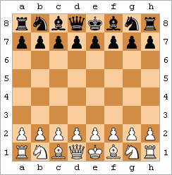 To start the game, White's pieces are placed on the first rank in the following order, from left to right: rook, knight, bishop, queen, king, bishop, knight, rook. Pawns are placed on each square of the second rank. Black's position mirrors White's, with equivalent pieces on every file.[2] The board is oriented so that the right-hand corner nearest each player is a light square; as a result the white queen always starts on a light square, while the black queen starts on a dark square. This may be remembered by the phrases "white on the right" and "queen on her color".[4]