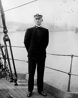 The destroyer Decatur ran aground on a mud bank in the Philippines on July 7, 1908, while under the command of Ensign Nimitz. The incident was the result of a navigational error. Nimitz had failed to check the harbor's tide tables and tried Batangas' harbor when the water level was low, leaving Decatur stuck until the tide rose again the next morning, and she was pulled free by a small steamer.[2] Following the grounding, a naval board of inquiry was convened to investigate the circumstances. The board found that Nimitz had indeed made an error in judgment, and he received a letter of reprimand.[9][10]