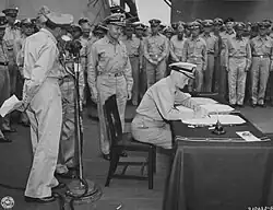 On September 2, 1945, Nimitz signed as representative of the United States when Japan formally surrendered on board USS Missouri in Tokyo Bay. On October 5, 1945, which had been officially designated as "Nimitz Day" in Washington, D.C., Nimitz was personally presented a second Gold Star for the third award of the Navy Distinguished Service Medal by President Harry S. Truman "for exceptionally meritorious service as Commander in Chief, U.S. Pacific Fleet and Pacific Ocean Areas, from June 1944 to August 1945".[29]