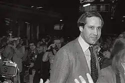 In 1987, his Cornelius Productions company signed a non-exclusive, first-refusal deal to develop four feature projects at the Warner Bros. studio, and set up a fifth project at Universal Pictures.[48] Chase hosted the Academy Awards in 1987 and 1988, opening the telecast in 1988 with the quip, "Good evening, Hollywood phonies!" In 1988, he starred alongside Madolyn Smith in Funny Farm, a sizeable hit at $25 million[49] that reached 64% approval rate on Rotten Tomatoes.[50] That same year, he appeared (albeit via a glorified cameo) in a sequel to Caddyshack, Caddyshack II, which made less than $12 million,[51] becoming one of his few flops at the time.[52]