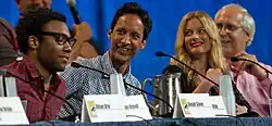 Starting in 2009, Chase returned to NBC in the sitcom Community, as aging moist-towelette tycoon Pierce Hawthorne. The show was created by Dan Harmon and starred Joel McHale, Alison Brie, Gillian Jacobs, Donald Glover, Danny Pudi, and Yvette Nicole Brown. The series received critical acclaim for its acting and writing, appeared on numerous critics' year-end "best-of" lists, and developed a cult following.[62][63] The New York Times critic Alessandra Stanley praised the casting of Chase writing, "Jeff has the kind of sardonic repartee and slapdash nonchalance that the comedian Chevy Chase had when he was the young star of the Fletch movies", while adding, "Even that is an inside casting joke: Mr. Chase, who is farcically loopy and delightful in the pilot."[64]