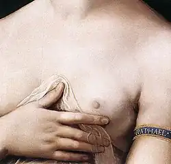 The Raphael painting illustrated, with light coming from the left, demonstrates both delicate modelling chiaroscuro to give volume to the body of the model, and strong chiaroscuro in the more common sense, in the contrast between the well-lit model and the very dark background of foliage. To further complicate matters, however, the compositional chiaroscuro of the contrast between model and background probably would not be described using this term, as the two elements are almost completely separated. The term is mostly used to describe compositions where at least some principal elements of the main composition show the transition between light and dark, as in the Baglioni and Geertgen tot Sint Jans paintings illustrated above and below.