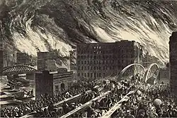 Chicago was incorporated as a city in 1837 near a portage between the Great Lakes and the Mississippi River watershed. It grew rapidly in the mid-19th century.[10][11] In 1871, the Great Chicago Fire destroyed several square miles and left more than 100,000 homeless,[12] but Chicago's population continued to grow.[11] Chicago made noted contributions to urban planning and architecture, such as the Chicago School, the development of the City Beautiful movement, and the steel-framed skyscraper.[13][14]