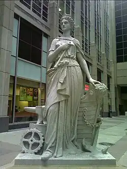 The 1885 allegorical architectural sculptures of 35 ft (11 m) Industry and Agriculture, two figures of a four-piece set, were removed from the original building and now stand in a nearby pedestrian plaza.[12]