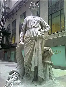 The central structure is capped by a 6,500 pound, 31 ft (9.4 m) tall aluminum statue by sculptor John H. Storrs of the Roman goddess of grain, Ceres, holding a sheaf of wheat in the left hand and a bag of corn in the right hand, as a nod to the exchange's heritage as a commodities market. This statue was assembled from 40 pieces.[27][28]