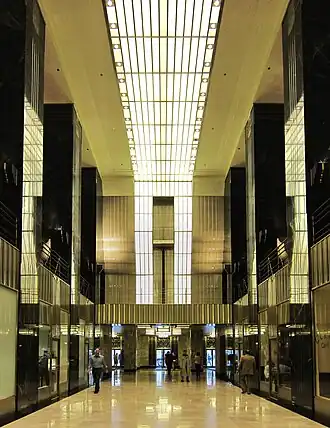 In 2005, the building underwent an extensive $20 million renovation directed by Chicago architect Gunny Harboe, whose restoration work included Loop landmarks the Rookery Building and Reliance Building. The project included restoration of the main lobby to emphasize the design features of the art deco era, elevator modernization, façade renovation and cleaning, and the continued renovation of upper floor corridors and hallways.[38][39] Though impractically small for modern use, mailboxes in the lobby were restored to their original condition to follow the theme of vertical lines found throughout the complex.[40] An improved electrical infrastructure, with ten main feeds from seven different Commonwealth Edison electrical substations, was added in addition to redundant cooling systems and upgraded telecommunications capabilities.