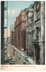 Viewing galleries were opened to the public for the first time in honor of the 1893 World's Columbian Exposition.[4] Two years later, the clock tower was removed and the "tallest building in Chicago" record was then held by the 302 ft (92 m) tall Masonic Temple Building.[10] Built on caissons surrounded by muck, the trading house was rendered structurally unsound in the 1920s when construction began across the street on the Federal Reserve Bank of Chicago. The 1885 building was subsequently demolished in 1929,[11] and the exchange temporarily moved to Van Buren and Clark while a new building was constructed at the LaSalle and Jackson site.