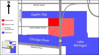 The skyscraper was being constructed at 400 N. Lake Shore Drive, on Chicago's waterfront west of Navy Pier and northeast of the Loop, in the Streeterville neighborhood of the Near North Side community area. The site is at the junction of Lake Michigan and the Chicago River, and is bordered by the Ogden Slip of the Chicago River to the north, North Lake Shore Drive to the east, the Chicago River to the south, and existing residential property to the west. The site was originally zoned for two 35 to 50-story buildings.[11] Originally, it was to be sold by a joint venture of LR Development Company of Chicago and JER Partners of Virginia for $64 million to Christopher Carley of the Fordham Company.[54] After numerous short-term extensions, and later Carley's failure to obtain financing, Kelleher of Shelbourne Development purchased the land instead and pledged to finance the rest of the project.[16]