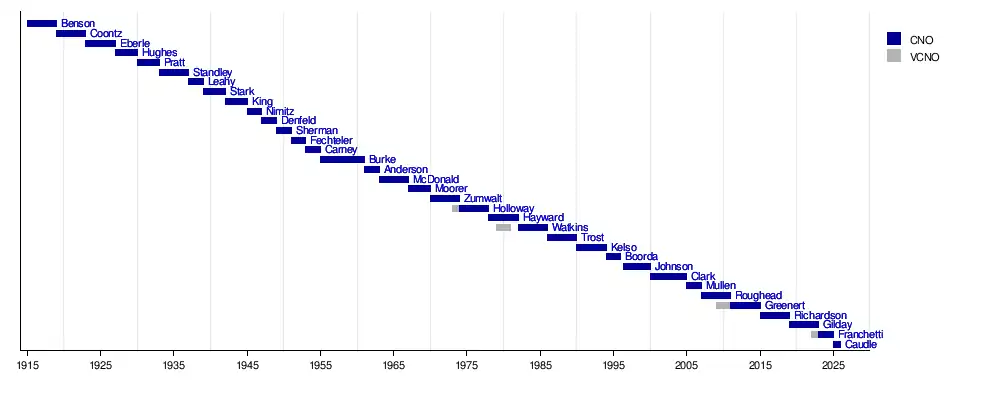 As of 25 August 2025, the 34th chief of naval operations is Admiral Daryl Caudle.[1]