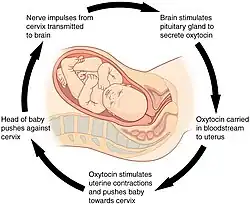 During the later stages of gestation, there is an increase in abundance of oxytocin, a hormone that is known to evoke feelings of contentment, reductions in anxiety, and feelings of calmness.[39] Oxytocin is further released during labour when the fetus stimulates the cervix and vagina, and it is believed that it plays a major role in the bonding of a mother to her infant and in the establishment of maternal behaviour. The father of the child also has an increase in oxytocin levels following contact with the infant and parents with higher oxytocin levels show being more responsive and "in synch" in their interactions with their infant. The act of nursing a child also causes a release of oxytocin to help the baby get milk more easily from the nipple.[40][41]