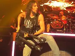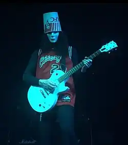 In March 2000, Rose hired Buckethead to replace Finck.[78] His eccentric stage persona – a white mask and a KFC bucket on his head – led to rumors he was Slash in disguise.[79] Josh Freese said of writing songs at the time "I wrote three or four songs... There would be an A-list and a B-list of tracks on the old dry-erase board... Forever, I had three or four songs on the A-list... but they all had working titles, because they were just instrumentals at the time."[80] Freese left after his contract ended to join A Perfect Circle, formed by Billy Howerdel, who had exited the project months earlier.[81][82] Freese, frustrated by the lack of touring, likened the band to "a giant jumbo jet sat on the tarmac".[83] On Buckethead's recommendation, Brain was hired as drummer.[84][85]