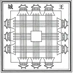 Chinese urban planning is based on fengshui geomancy and the well-field system of land division, both used since the Neolithic age. The basic well-field diagram is overlaid with the luoshu, a magic square divided into 9 sub-squares, and linked with Chinese numerology.[35] In Southern Song dynasty (1131AD), the design of Hongcun city in Anhui was based around "harmony between man and nature", facing south and surrounded by mountains and water. According to fengshui, it is a carefully planned ancient village and shows the Human-Nature Intergraded Ecological Planning concept.[36]