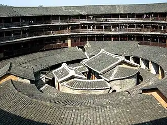 A tulou outer building encloses a smaller circular building, which encloses an ancestral hall and courtyard in the center.