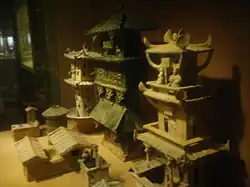 Models of watchtowers and other buildings made during the Eastern Han dynasty (AD 25–220); while these models were made of ceramics, the real versions were made of easily perishable wood and have not survived.