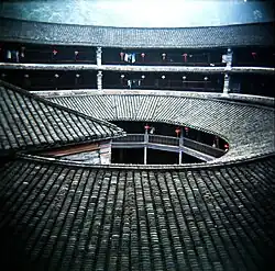 Some commoners living in areas plagued by bandits built communal fortresses called Tulou for protection. Often favoured by the Hakka in Fujian and Jiangxi, the design of Tulou shows the ancient philosophy of harmony between people and environment. People used local materials, often building the walls with rammed earth. No window reached the outside on the lower two floors (for defense), but the inside included a common courtyard and let people gather.[27]