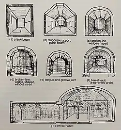 The tombs and mausoleums of imperial family members, such as the 8th-century Tang dynasty tombs at the Qianling Mausoleum, can be counted as part of the imperial tradition. These above-ground earthen mounds and pyramids had subterranean shaft-and-vault structures that were lined with brick walls since at least the Warring States period (481–221 BC).[29]