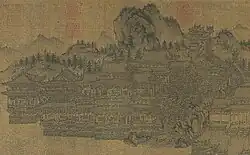 English: A mural painting from Cave 61 at the Mogao Caves, depicting Tang dynasty monastic architecture from Mount Wutai.