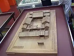 A sancai (tri-colored) ceramic mansion from the Tang dynasty (618–907), excavated from a Tang era tomb at Zhongbu village in the western suburbs of Xi'an. The rectangular compound has two sections of courtyards. The buildings on the axis include central entrance, four-pointed pavilion, mountain-shaped front hall, artificial mountain and ponds, eight-pointed pavilion and mountain-shaped retiring quarters. The two sides of the axis are arranged with corridor rooms symmetrically.