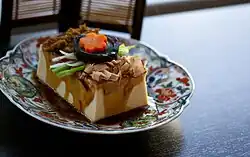 Tofu is made of soybeans and is another popular food product that supplies protein. The production process of tofu varies from region to region, resulting in different kinds of tofu with a wide range of texture and taste.[37] Other products such as soy milk, soy paste, soy oil, and fermented soy sauce are also important in Chinese cooking.