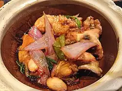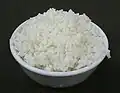 Rice was domesticated in the Yangtze River basin in southern China approximately 9,000 years ago and is a primary staple food for people from rice farming areas in southern China.[41] Steamed rice (Chinese: 米饭 mǐfàn), usually white rice, is the most commonly eaten form. People in South China also like to use rice to make congee as breakfast.[42] Rice is also used to produce beer and vinegar. Glutinous rice ("sticky rice") is a variety of rice used in special dishes such as lotus leaf rice and glutinous rice balls.