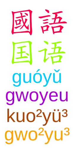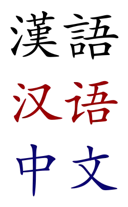 Hànyǔ[a] written in traditional (top) and simplified (middle) forms, Zhōngwén[b] (bottom)