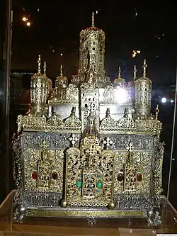 Chiprovtsi has a museum of history that occupies two old-style buildings and features four exhibitions. These present the domestic life from Antiquity through the Middle Ages and the 17th-century heyday until today, as well as works of the Chiprovtsi goldsmithing and carpet industry.[59] The town has an Eastern Orthodox church dedicated to the Ascension of Jesus; the remains of the old Roman Catholic church of Saint Mary have also been preserved.[60] The Chiprovtsi Monastery is situated outside the town; there are ruins of several other Orthodox churches and another monastery.[61]