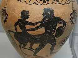 His nobility is further reflected in the story of his death: although immortal, Chiron willingly relinquished his immortality after being incurably wounded, an act that allowed Zeus to release Prometheus from his punishment for giving fire to humankind.[36] As the son of Cronus he could not die naturally, so it was left to Heracles to negotiate the exchange with Zeus. Chiron was pierced with an arrow belonging to Heracles that had been treated with the blood of the Hydra, or, in other versions, poison that Chiron had previously given to Heracles during the period when Heracles was under Chiron’s tutelage. According to a Scholium on Theocritus,[37] this had taken place during the visit of Heracles to the cave of Pholus on Mount Pelion in Thessaly during his fourth labour, defeating the Erymanthian Boar. While they were at supper, Heracles asked for some wine to accompany his meal. Pholus, who ate his food raw, was taken aback. He had been given a vessel of sacred wine by Dionysus sometime earlier, to be kept in trust by the centaurs until the right time for its opening. At Heracles' prompting, Pholus was forced to produce the vessel of sacred wine. The hero, gasping for wine, grabbed it from him and forced it open. Thereupon the vapors of the sacred wine wafted out of the cave and intoxicated the wild centaurs led by Nessus who had gathered outside. They attacked with stones and fir trees the cave which was located in the neighbourhood of Malea. Heracles was forced to shoot many arrows (poisoned with the blood of the Hydra) to drive them back. During the assault, Chiron was hit in the thigh by one of the poisoned arrows. After the centaurs had fled, Pholus emerged from the cave to observe the destruction. Being of a philosophical frame of mind, he pulled one of the arrows from the body of a dead centaur and wondered how such a little thing as an arrow could have caused so much death and destruction. In that instant, he let slip the arrow from his hand and it dropped and hit him in the hoof, killing him instantly. This, however, is open to controversy, because Pholus shared the "civilized centaur" form with Chiron in some art images, and thus would have been immortal.