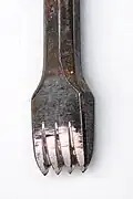 In leather work, a chisel is a tool used to punch holes in a piece leather. The chisel has between one and seven (or possibly more) tines that are carefully placed along the line where the holes are desired, and then the top of the chisel is struck with a hammer until the tines penetrate the leather. They are then withdrawn, and the leather worker then stitches through the resulting holes.