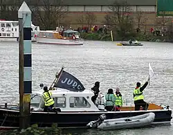 The Chiswick reach of the Thames is heavily used for competitive and recreational rowing. Championship Course from Mortlake to Putney runs past Chiswick Eyot and Duke's Meadows. The Boat Race is contested on the Championship Course on a flood tide (in other words from Putney to Mortlake) with Duke's Meadows a popular view-point for the closing stages of the race. The finishing post is just downstream of Chiswick Bridge.[101] Other important races such as the Head of the River Race race the reverse course, on an ebb tide.[102] Chiswick is home to several clubs. The University of London Boat Club is based in its boathouse off Hartington Road, which also houses the clubs of many London colleges and teaching hospitals; recent members include Tim Foster, Gold medallist at the Sydney Olympics and Frances Houghton, World Champion in 2005, 2006 and 2007.[103] Quintin Boat Club lies between Chiswick Quay Marina and Chiswick Bridge.[104] Tideway Scullers School is just downriver of Chiswick Bridge; its members include single sculling World Champion Mahé Drysdale and Great Britain single sculler Alan Campbell.[105]