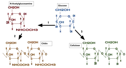 Chitin is a modified polysaccharide that contains nitrogen; it is synthesized from units of N-acetyl-D-glucosamine (to be precise, 2-(acetylamino)-2-deoxy-D-glucose). These units form covalent β-(1→4)-linkages (like the linkages between glucose units forming cellulose). Therefore, chitin may be described as cellulose with one hydroxyl group on each monomer replaced with an acetyl amine group. This allows for increased hydrogen bonding between adjacent polymers, giving the chitin-polymer matrix increased strength.