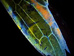 A close-up of the wing of a leafhopper; the wing is composed of chitin.