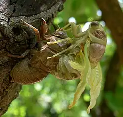 A cicada emerges from its nymphal exoskeleton; the shed exoskeleton is mostly modified chitin (sclerotin) but the wings and much of the adult body are still unsclerotized chitin at this stage