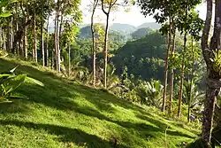During the dry season, the grass-covered hills dry up and turn chocolate-brown.[4] The vegetation is dominated by grass species such as Imperata cylindrica and Saccharum spontaneum. Several Compositae and ferns also grow on them. In between the hills, the flatlands are cultivated with rice and other cash crops. However, the natural vegetation on the Chocolate Hills is threatened by quarrying activities.[8]