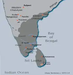 During the reign of Rajaraja Chola I and his successors Rajendra Chola I, Virarajendra Chola and Kulothunga Chola I the Chola armies invaded Sri Lanka, the Maldives and parts of Southeast Asia like Malaysia, Indonesia and Southern Thailand[56] of the Srivijaya Empire in the 11th century. Rajaraja Chola I launched several naval campaigns that resulted in the capture of Sri Lanka, Maldives and the Malabar Coast.[57] In 1025, Rajendra Chola launched naval raids on the ports of Srivijaya and against the Burmese kingdom of Pegu.[58] A Chola inscription states that he captured or plundered 14 places, which have been identified with Palembang, Tambralinga and Kedah among others.[59] A second invasion was led by Virarajendra Chola, who conquered Kedah in Malaysia of Srivijaya in the late 11th century.[60] Chola invasion ultimately failed to install direct administration over Srivijaya, since the invasion was short and only meant to plunder the wealth of Srivijaya. However, this invasion gravely weakened the Srivijayan hegemony and enabled the formation of regional kingdoms. Although the invasion was not followed by direct Cholan occupation and the region was unchanged geographically, there were huge consequences in trade. Tamil traders encroached on the Srivijayan realm traditionally controlled by Malay traders and the Tamil guilds' influence increased on the Malay Peninsula and the north coast of Sumatra.