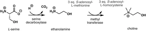 In plants, the first step in de novo biosynthesis of choline is the decarboxylation of serine into ethanolamine, which is catalyzed by a serine decarboxylase.[7] The synthesis of choline from ethanolamine may take place in three parallel pathways, where three consecutive N-methylation steps catalyzed by a methyl transferase are carried out on either the free-base,[8] phospho-bases,[9] or phosphatidyl-bases.[10] The source of the methyl group is S-adenosyl-L-methionine and S-adenosyl-L-homocysteine is generated as a side product.[11]
