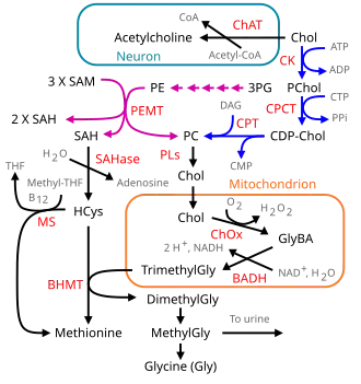 Choline is required to produce acetylcholine – a neurotransmitter – and S-adenosylmethionine (SAM), a universal methyl donor. Upon methylation SAM is transformed into S-adenosyl homocysteine.[2]