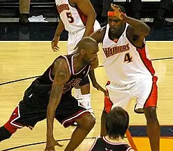 On January 29, 2008, the Golden State Warriors signed Webber for the rest of the season.[36][37][38] Terms of the deal were not disclosed, but the San Francisco Chronicle reported that he would receive the pro-rated veteran's minimum of $1.2 million[39] (approximately $570,000).[40] This came after a rejected offer by the Los Angeles Lakers who were trying to coax Webber in with two 10-day contracts so they could decide afterwards if they wanted him the rest of the season.[37] This also put to rest talks of joining the Detroit Pistons, Dallas Mavericks, or retirement.[41] He played in only nine games for the Warriors, averaging 3.9 points and 3.6 rebounds in 14 minutes per game.[16]