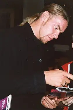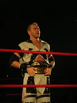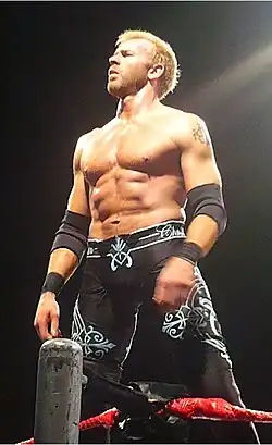 In September 1994, Reso enrolled in a wrestling school run by Ron Hutchison at Sully's Gym.[3] One of his early ring names was Christian Cage, a combination of the names of actors Christian Slater and Nicolas Cage.[3][9] Cage's wrestling career began in June 1995 in a match against Zakk Wyld, which resulted in a draw.[3] In 1997, he was a part of Thug Life, a stable that included Joe E. Legend, Zakk Wyld, Rhino Richards, and Copeland (under the name Sexton Hardcastle).[10] As a tag team on the Canadian independent circuit, Reso and Copeland were known as High Impact and later The Suicide Blondes.[11] The duo held titles in numerous promotions and competed in the United States and Japan.[12] Reso won the East Coast Wrestling Association (ECWA) Heavyweight Championship on July 18, 1998, which he held until October 15, 1999.[13] When Copeland received a tryout match with the World Wrestling Federation (WWF), Reso went with him and they faced off in a non-televised tryout match, which Copeland was booked to win.[12] After the tryout, once Copeland was promoted from his developmental status to touring with the WWF, he put in a good word for Reso and got him invited to Dory Funk Jr.'s WWF-affiliated Funking Conservatory training camp in 1998.[14] After completing his training at the conservatory, Reso signed a contract with the WWF to become a full-time performer.[12]