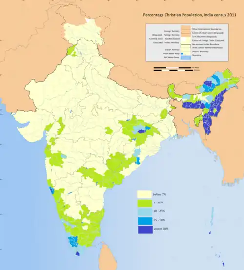 Christianity is India's third-largest religion with 28 million adherents, who make up 2.3 percent of the population as of the 2011 census.[2] Christianity is the largest religion in parts of Northeast India, specifically in Nagaland, Mizoram and Meghalaya.[4] It is also a significant religion in Manipur, which is 41 percent Christian.[5]