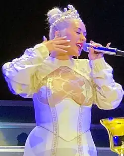 In August 2003, at the 2003 MTV Video Music Awards, Aguilera opened the show singing "Like a Virgin" and "Hollywood" alongside Britney Spears.[106] Halfway through the performance, she was joined by Madonna whom they both kissed, consequently making the performance highly publicized.[107] Various media outlets retrospectively considered it one of the "most iconic" VMAs performances of all time.[108] In 2008, MTV listed the performance as the number-one opening moment in the history of MTV Video Music Awards,[109] while Blender magazine cited it as one of the twenty-five sexiest music moments on television history.[110] In November of that year, Aguilera hosted the 2003 MTV Europe Music Awards.[111] She received widespread media attention for dressing up as a nun and being undressed to reveal her underclothes while performing the slutdrop dance style.[112] She was later named Top Female Pop Act of 2003 by Billboard.[113]